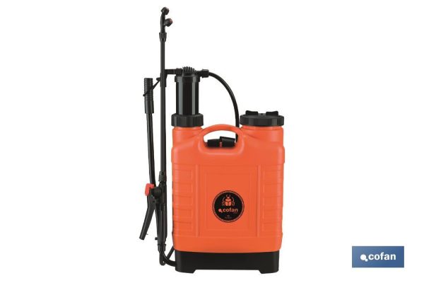 Pulverizador de espalda con capacidad para 12 litros. El pulverizador es manual y cuenta con una lanza de 50 cm. Presión de hasta 3 bares. Incorpora un gatillo ergonómico. Está indicado para usarse sobre árboles, plantas, flores o huertos. Se utiliza principalmente en agricultura y jardín. Incluye 3 boquillas y cuenta con correas ajustables para la comodidad del usuario. Color naranja y negro. Está fabricado en polipropileno de alta calidad, lo hace resistente y duradero. Pesa 2,2 kg.