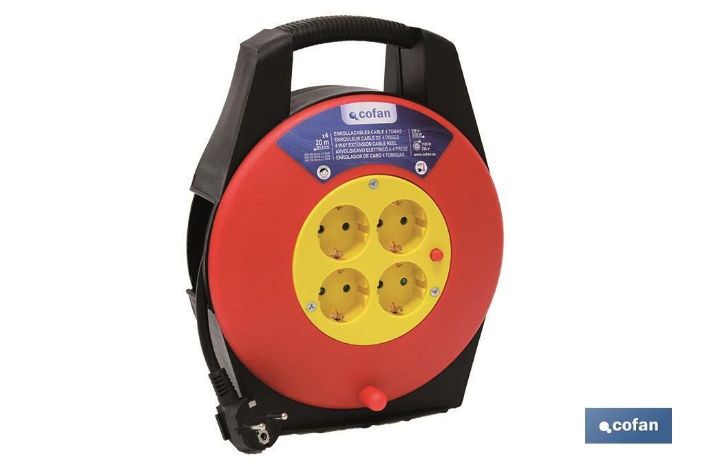 Enrollacables eléctrico con cuatro tomas o enchufes y 20 metros de longitud. Enrollacables provisto de conmutador de seguridad por sobrecarga, seguridad para niños. Tambor enrollador de cable de 20 metros de largo y sección de 3 x 1,5 mm.
