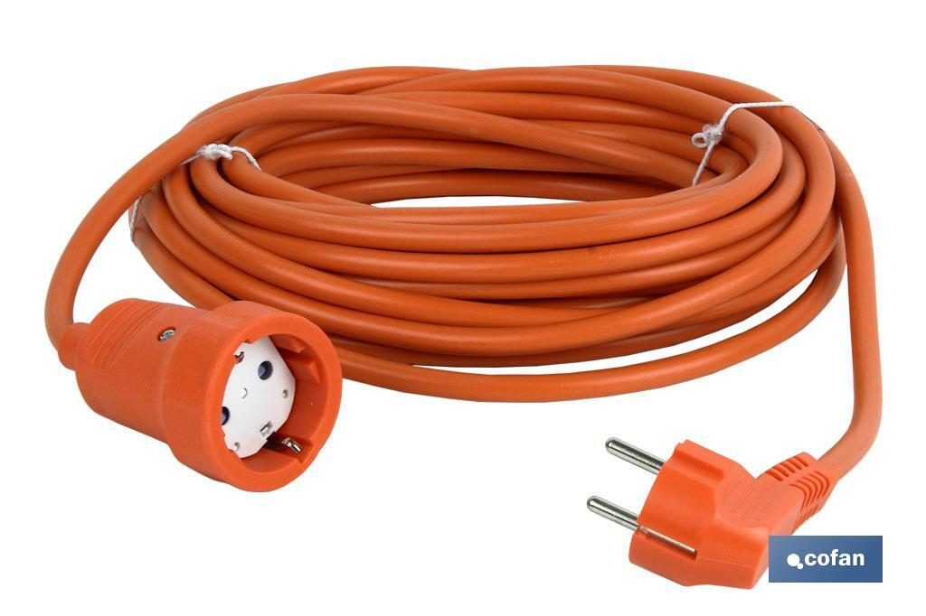 Prolongador o alargadera bipolar, con toma de tierra lateral. El cable es de color naranja y su sección es de 3G 1 x 5 mm2. La longitud del cable está disponible en dos medidas, de 25 metros. Es apto para exteriores o jardines debido a su gran resistencia a condiciones climatológicas adversas IP 44.