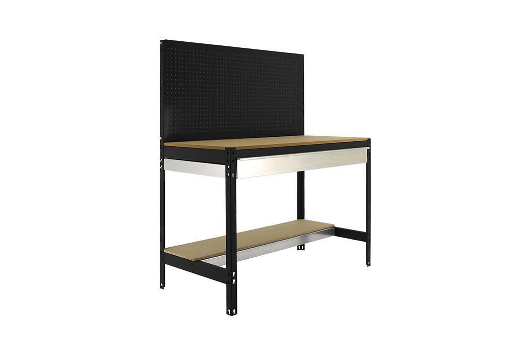 Banco de trabajo con estructura de acero de color antracita. Este es un accesorio perfecto para tu taller, con el que puedes desarrollar tu trabajo de forma profesional o como aficionado al bricolaje. La mesa es muy robusta y versátil, ya que cuenta con una encimera resistente que soporta una carga de hasta 600 kg y un estante inferior que resiste 75 kg. Además, incluye un panel de herramientas fabricado en acero ideal para tener todas tus herramientas colgadas y ordenadas. El banco de trabajo es muy fácil y rápido de instalar. Fabricado en acero de gran calidad y resistente a la oxidación. Dispone de unas medidas de 144,5 cm de alto, 91 cm de ancho y 61 cm de profundidad.