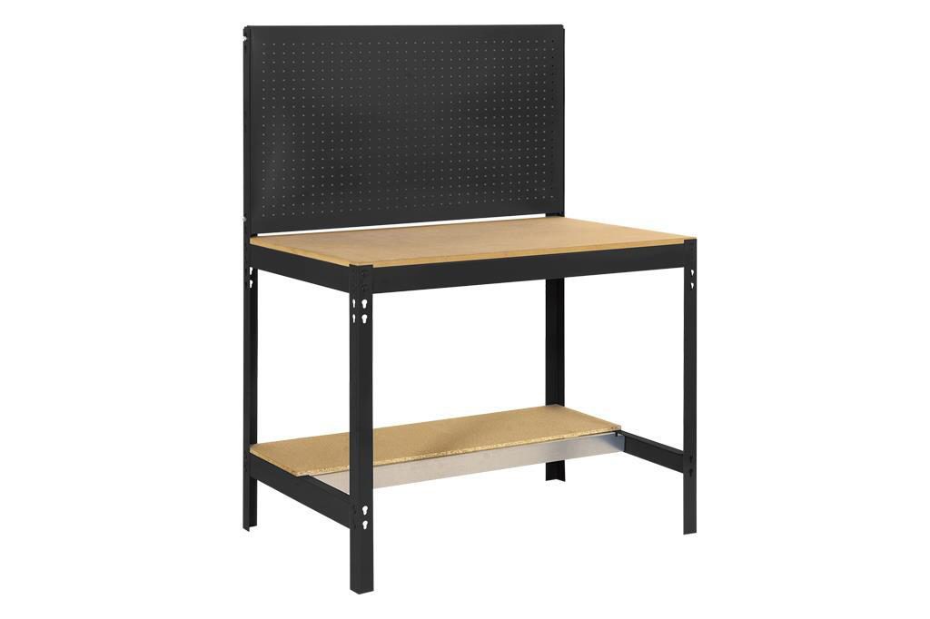 Banco de trabajo con estructura de acero de color antracita. Este es un accesorio perfecto para tu taller, con el que puedes desarrollar tu trabajo de forma profesional o como aficionado al bricolaje. La mesa es muy robusta y versátil, ya que cuenta con una encimera resistente que soporta una carga de hasta 600 kg y un estante inferior que resiste 75 kg. Además, incluye un panel de herramientas fabricado en acero ideal para tener todas tus herramientas colgadas y ordenadas. El banco de trabajo es muy fácil y rápido de instalar. Fabricado en acero de gran calidad y resistente a la oxidación. Dispone de unas medidas de 144,5 cm de alto, 91 cm de ancho y 61 cm de profundidad.