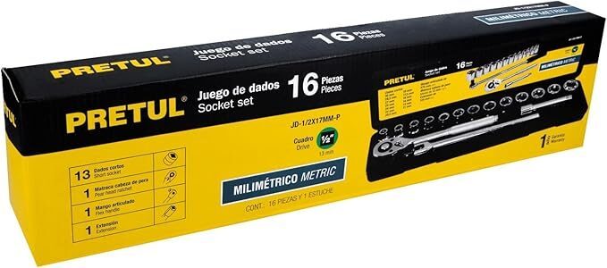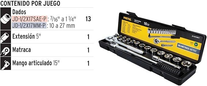 13 Llaves de vaso (10 a 27 mm), 1 Extensión (5″), 1 Matraca, 1 Mango articulado (15″).