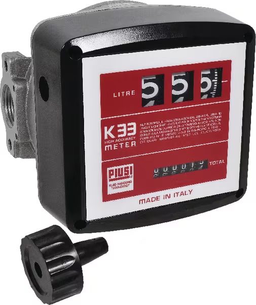 Los PIUSI K33 y K44 son medidores de flujo mecánicos adecuados para la supervisión del diésel. El PIUSI K33 como medidor de flujo mecánico tiene un indicador parcial de 3 dígitos (máx. 999 litros), total 6 dígitos, mientras que el PIUSI K44 tiene un indicador parcial de 4 dígitos (máx. 9999 litros), con un total de 7 dígitos.