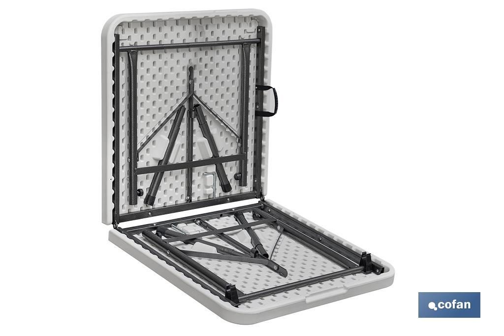 Mesa plegable rectangular de color blanco fabricada en polietileno de alta densidad y con estructura de acero pintado. Es ideal para utilizarla en eventos o celebraciones, así como para disponer de una mesa ocasional en jardines, camping, trabajos especiales, etc. Apta tanto para uso interior como para exterior. Soporta temperaturas extremas y, además, es impermeable y resistente a los rayos UV. Es una mesa robusta, fácil de abrir y cerrar, que ocupa poco espacio cuando esta plegada. Incluye un asa para hacer más fácil su transporte. Cuenta con travesaños ergonómicos y un tablero articulado de 45 mm de grosor para un óptimo almacenaje. Es ideal para que la utilicen entre 4 y 6 personas y soporta un peso máximo de hasta 150 kg.